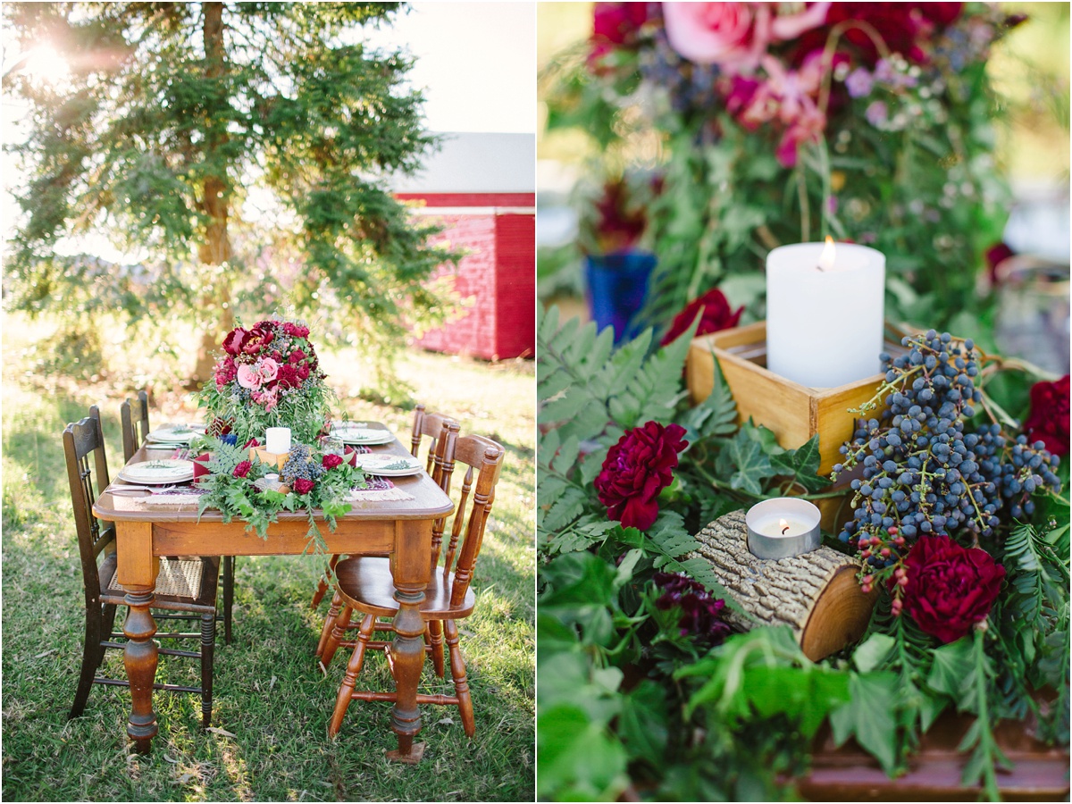 This Styled shoot was a dream to create with the most wonderful group of vendors from around the north coast and beyond. Pillar Rock Farm created the perfect setting for this rustic, bohemian styled wedding shoot inspired by luxurious Jewel and burgundy tones. Each element was dreamed up to be natural, wild and whimsical to convey the feeling of a romantic country wedding with an eclectic vibe. We are in love with the rich jewel tones from the florals, the natural textures of the countryside and vibrant Red of the American Style Barn. I loved working with the vendors to create a truly lovely wedding setting full of whimsical romance. This shoot was recently published in North Coast Weddings Magazine Spring /Summer Edition.